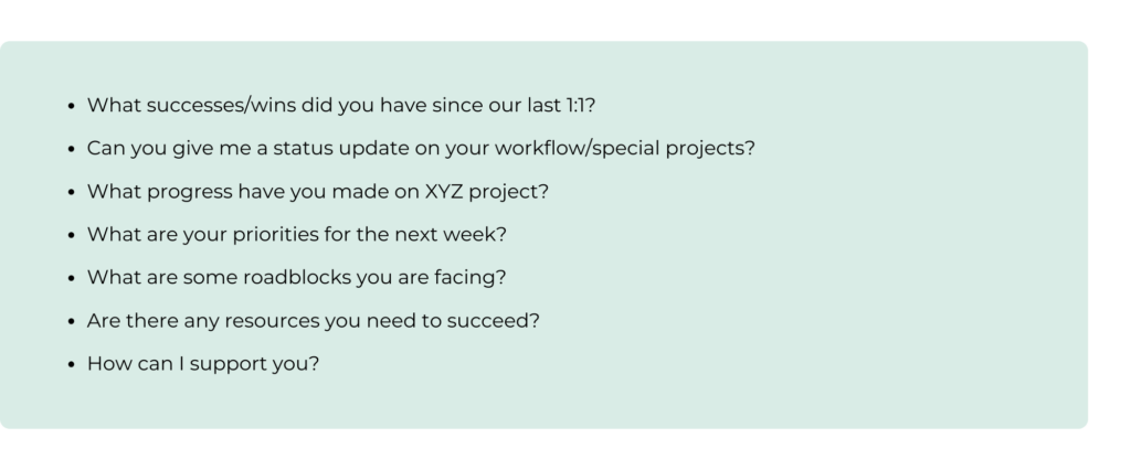 One-on-one meetings can and should cover your employee’s workload, tasks, and any special projects. But they’re also your chance to make them feel heard, offer support, and build trust. Think of them as part check-in, part coaching session, part feedback loop.