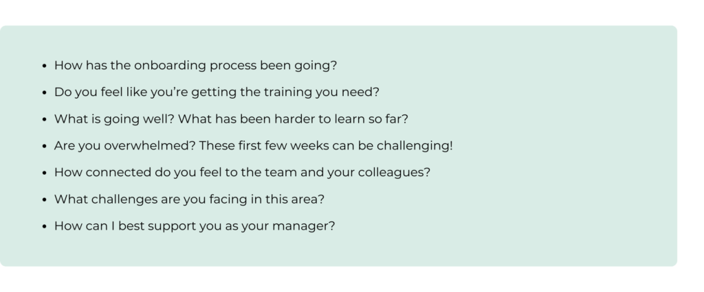 That first 1:1 with a new employee is a great chance to set the tone, get to know them, and start building trust. It’s also a time to talk about expectations and learn what they’re hoping to get out of the role. Here are a few questions to help guide the conversation: