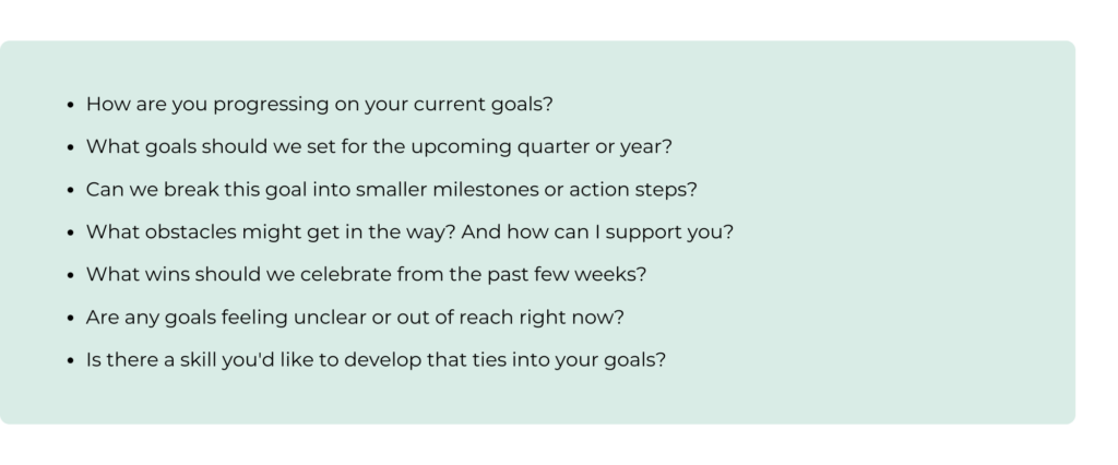 One-on-ones are a great time to set, revisit, and stay aligned on goals. At the start of the year, work with your employee to set clear, realistic goals. Then, carve out time once a month to check in on their progress. Here are a few prompts for a productive chat: