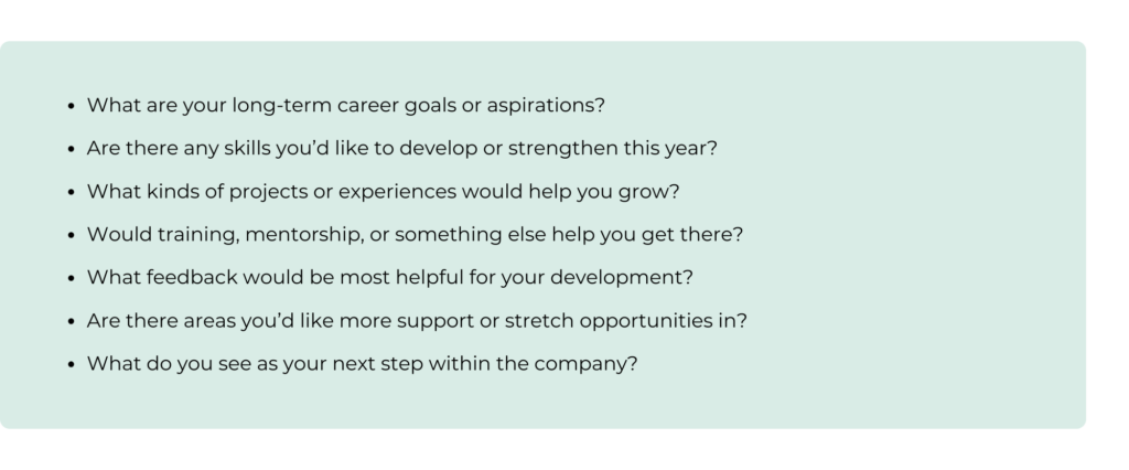 Career development talks are a great way to show you’re invested in your team’s long-term success. They build on your regular goal-setting check-ins and help you spot growth opportunities and plan ahead for future roles. Here are some question recommendations from the Ambrion leaders: