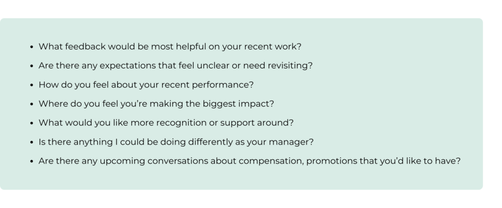 Formal reviews might only happen once or twice a year, but 1:1s give you a chance to talk about performance all year long. Keeping these conversations low-pressure and ongoing helps your team know where they stand, so there are no surprises when review time rolls around. Try asking some of these questions to guide the conversation: