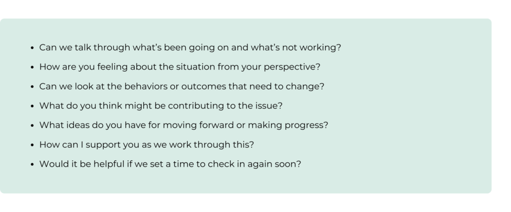 Some one-on-ones may involve more sensitive topics like performance concerns, missed expectations, or personal challenges. The goal isn’t to criticize, but to have a respectful, productive conversation that helps things move forward. Here are a few questions that can help guide those moments: